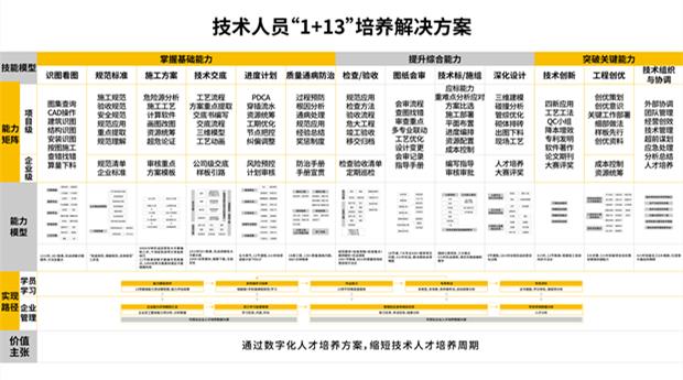 根据施工企业技术人员实际岗位职责能力要求,形成涵盖基础能力、综合能力、关键创新能力三个方面的技术人员13项岗位必备技能培养体系课程,创建人才能力评估模型,制定针对性培养计划,结合最新OMO培训模式,为施工企业提供“测、学、练、考、评”一体的技术人员培养专业化、系统化、数字化的人才培养解决方案,缩短技术人才培养周期。
